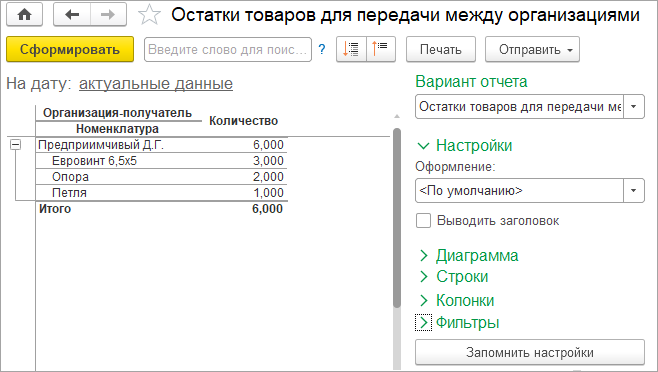 Необходимость заполнения документов можно увидеть в отчёте "Остатки товаров для передачи между организациями".