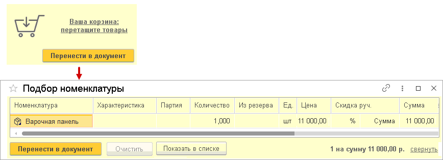 Таблица корзины содержит все поля документа, из которого открыт подбор.