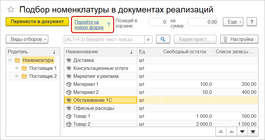 В любом документе, где ранее была форма подбора, переходите по ссылке "Перейти на новую форму" и используйте новые возможности.