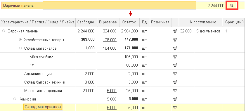 При выборе "лупы" из списка номенклатуры осуществляется переход в иерархию остатков.
