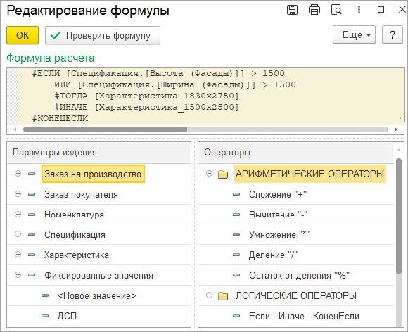 В формуле можно использовать все реквизиты изделий и заказов, а также