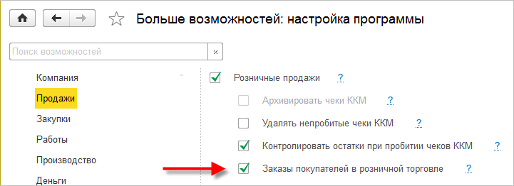 Чтобы использовать новую возможность, нужно установить флаг «Заказы покупателей в розничной торговле».