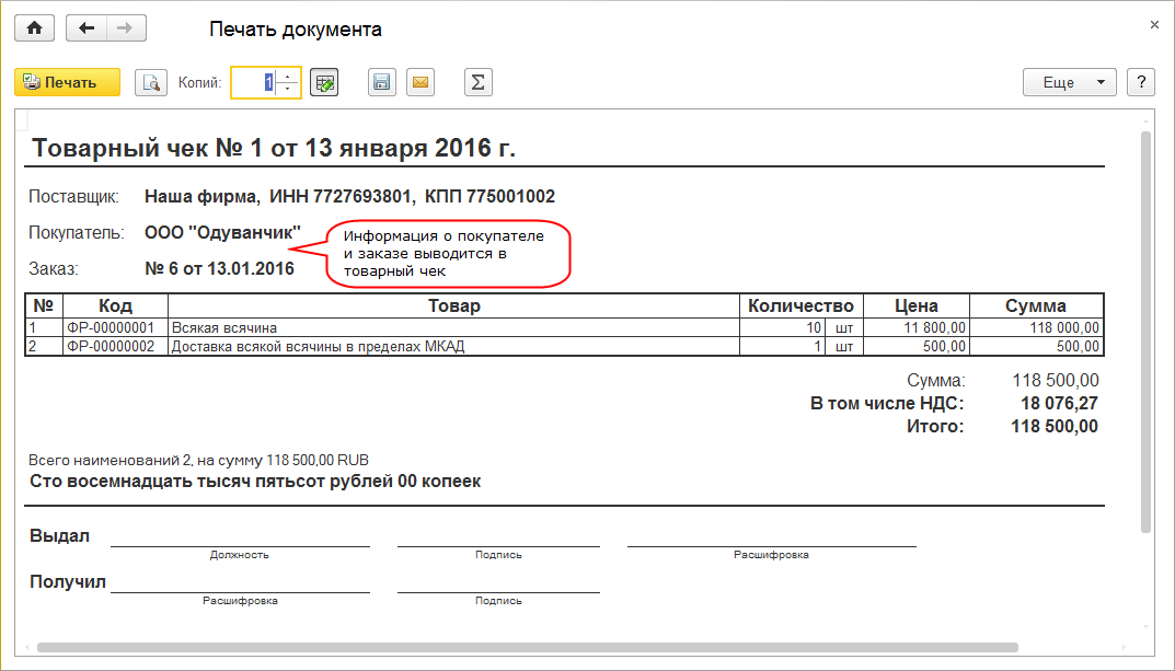 Информация о покупателе и заказе выводится в товарный чек, который можно сформировать из чека ККМ.