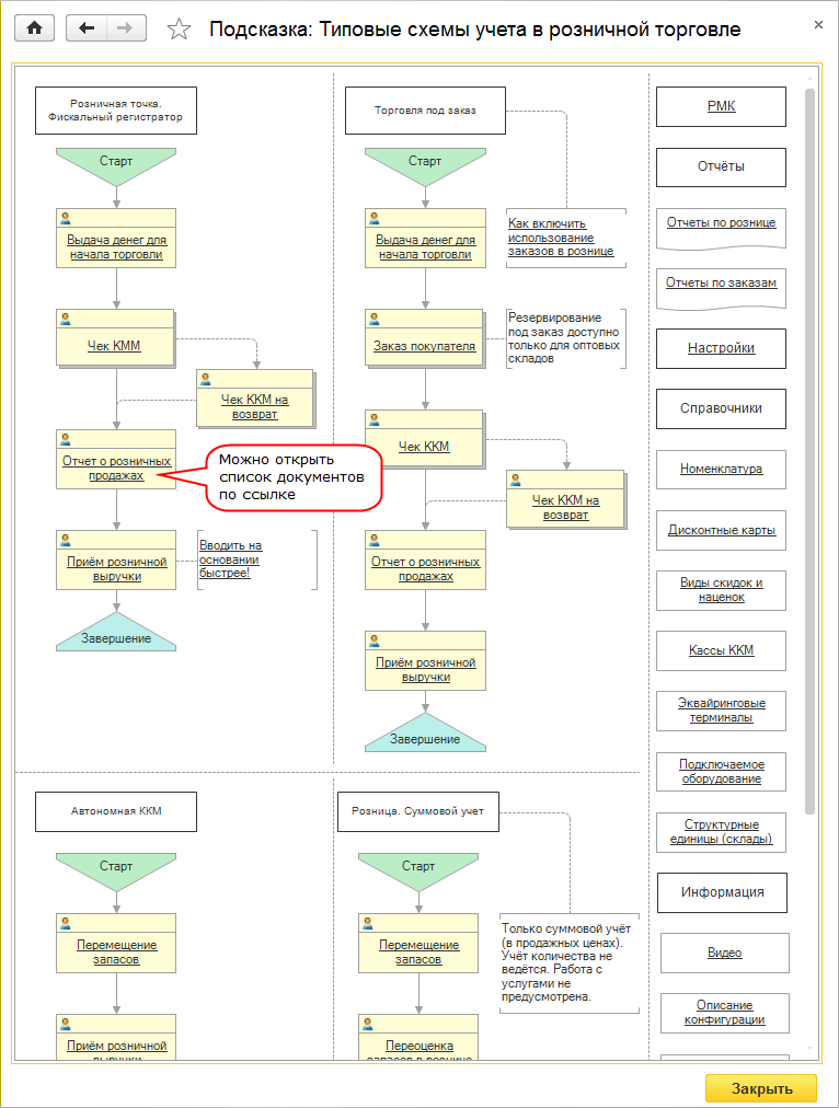 Добавлена подсказка по типовым схемам учёта с возможностью открыть по ссылке документы, справочники, обработки и учебные материалы.