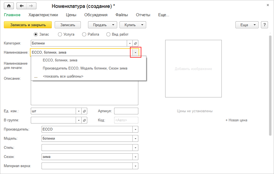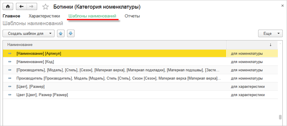 Если при создании новой номенклатуры или характеристики оставить поле «Наименование» пустым и перейти к редактированию остальных свойств, то наименование будет формироваться автоматически в режиме реального времени на основании последнего использованного шаблона.