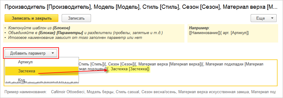 Сопроводительный текст каждого блока попадёт в наименование, если соответствующий параметр в карточке номенклатуры или характеристики заполнен.