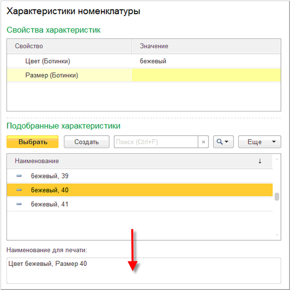 При подборе характеристики в документах, наименование для печати отображается под списком отобранных характеристик.