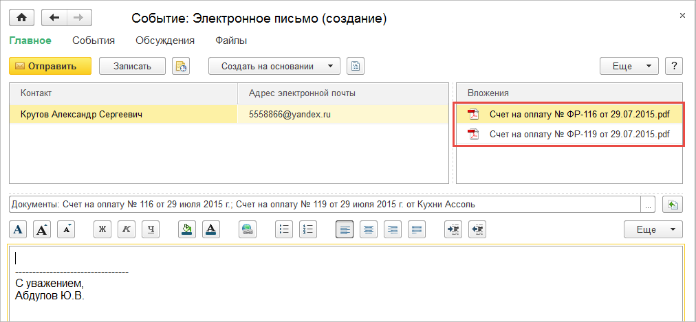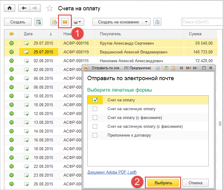 Для этого выделите нужные документы в списке, нажмите кнопку-конвертик и выберите нужные печатные формы и формат вложения.