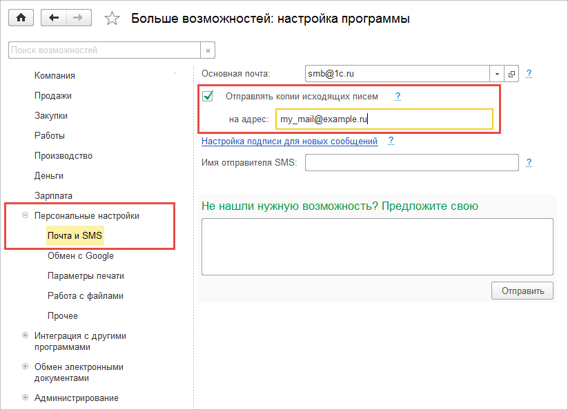 Чтобы использовать новую возможность, нужно установить флаг «Отправлять копии исходящих писем» и ввести адрес электронной почты, на который будут отправляться копии писем, в персональных настройках (Еще больше возможностей – Персональные настройки – Почта и SMS).