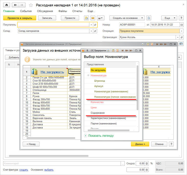 Так же добавлена возможность при загрузке данных в табличные части искать и сопоставлять номенклатуру по полному наименованию.