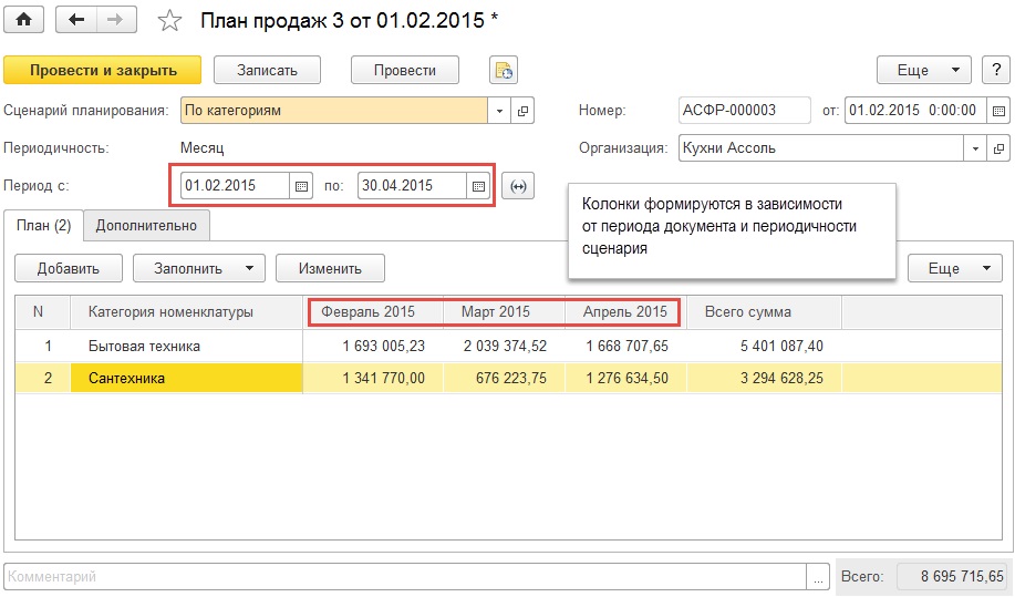 После того, как подготовлен сценарий планирования, мы можем перейти к формированию плана. План продаж будет зафиксирован в системе одноименным документом.