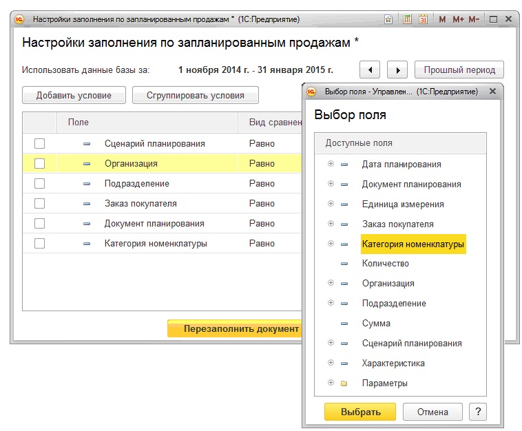 Для сценария с измерением «Номенклатура» появится дополнительная функция: