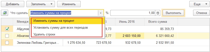 Заполненный ранее план можно отредактировать по кнопке «Изменить». В случае если выбран сценарий планирования «по категориям», «по группам» или «по менеджерам», то по кнопке изменить нам будут доступны следующие функции: