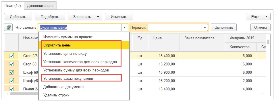 В случае если в сценарии включена детализация по количеству, в меню «Изменить» будут доступны операции изменения цен и количества номенклатуры.