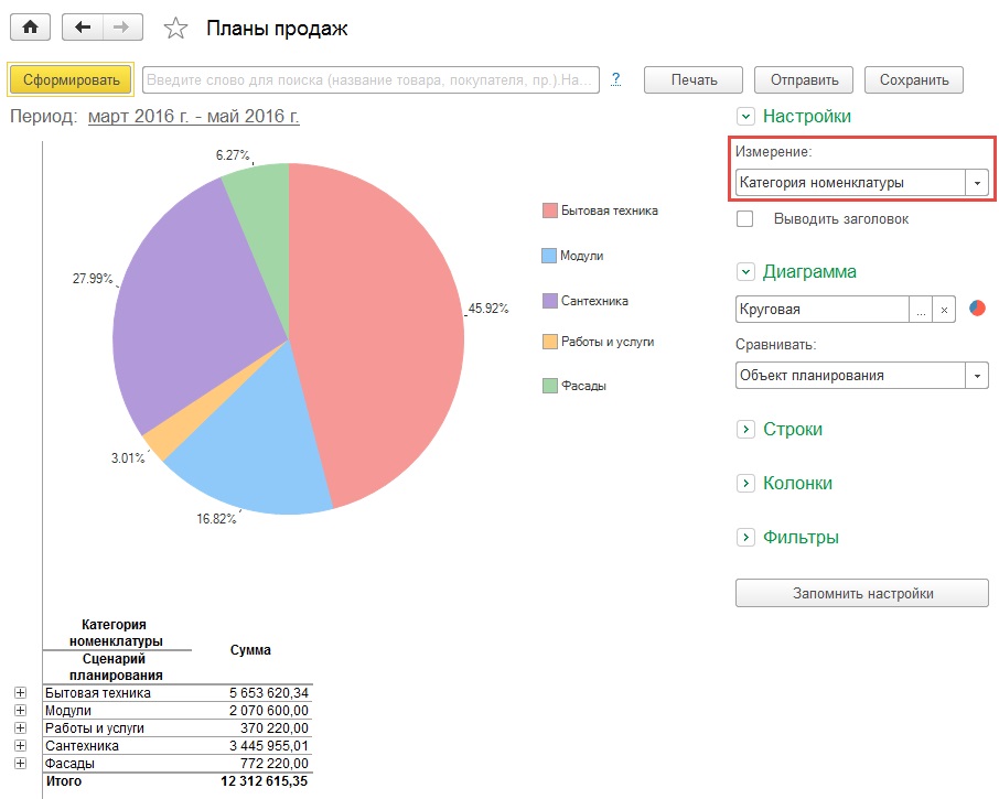 В связи с изменением подсистемы планирования переработаны отчеты «Планы продаж» и «План-фактный анализ продаж». Для более наглядного анализа в отчеты добавлена возможность построения диаграмм. Визуализация результатов позволит нам быстро оценить соотношение нескольких величин, например, при сравнении долей различных категорий товаров в планируемой прибыли.