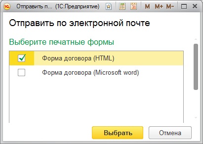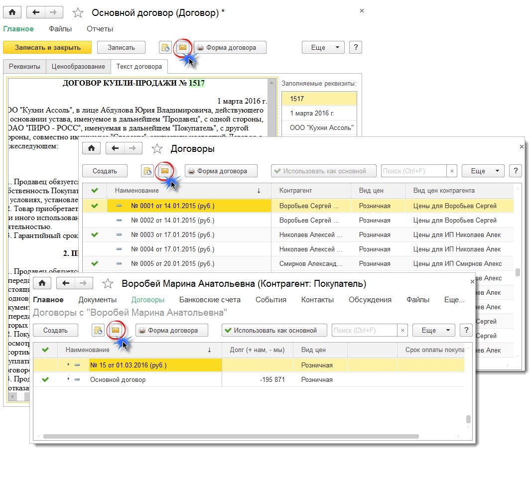 Кнопки отправки располагаются на формах списка и элемента договора, а также в карточке контрагента.