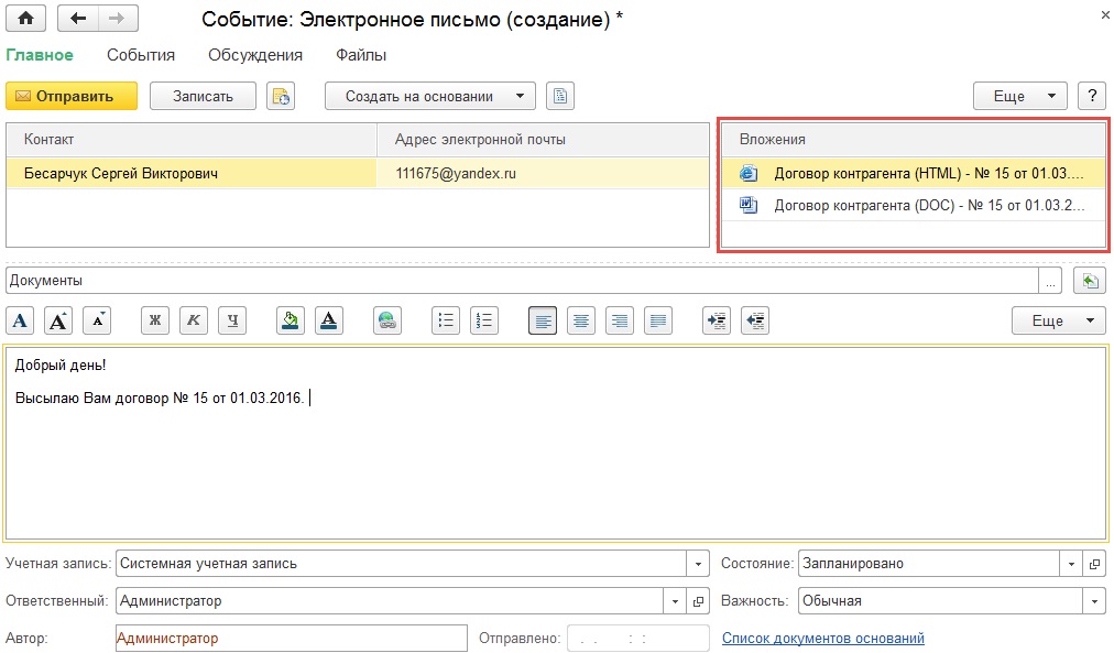 Файл в выбранном формате будет прикреплен к новому письму, остается только указать почту адресата и отправить письмо.