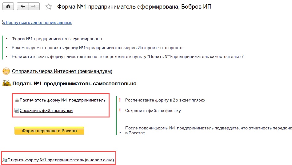 Отправка формы «№1-Предприниматель» через интернет напрямую из 1С возможна с помощью сервиса ![]()