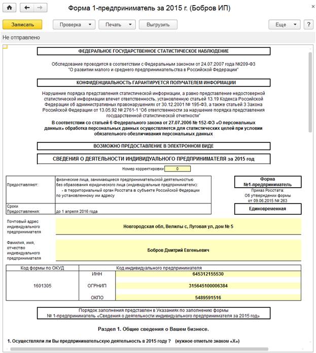 В целях реализации Федерального закона от 24 июля 2007 г. № 209-ФЗ "О развитии малого и среднего предпринимательства в Российской Федерации" федеральной службой государственной статистики утверждена новая форма статистического наблюдения для индивидуальных предпринимателей №1-Предприниматель «Сведения о деятельности индивидуального предпринимателя за 2015 год». Данная форма вводится в действие для отчета за 2015 год и доступна пользователям программы, начиная с версии 1.6.5.