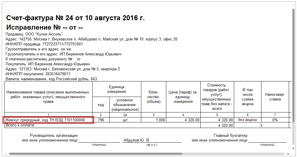 В печатной форме счета-фактуры, выписанного после 01.07.2016 по ставке 0%, дополнительно к наименованию товара будет указан код ТН