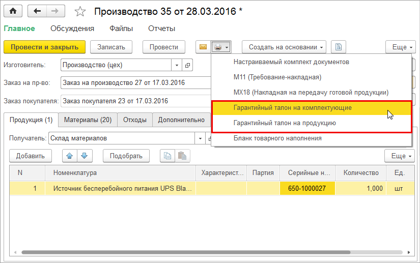 Печать гарантийного талона доступна из документа "Производство" и списка документов.