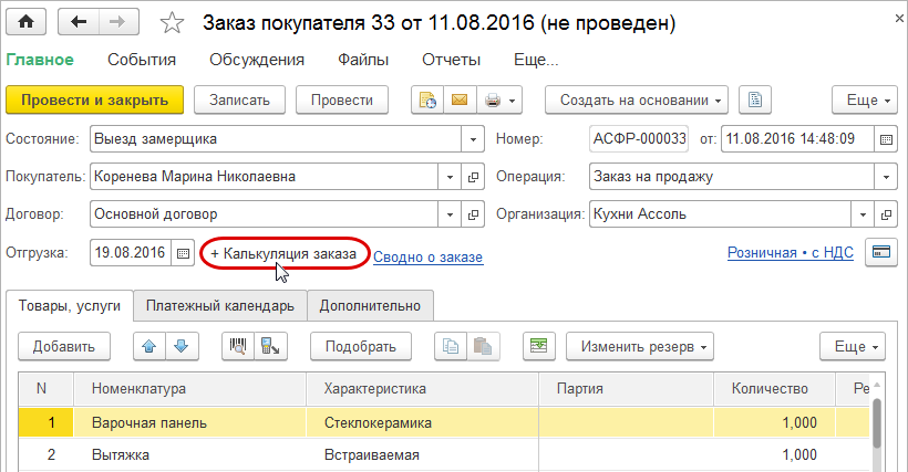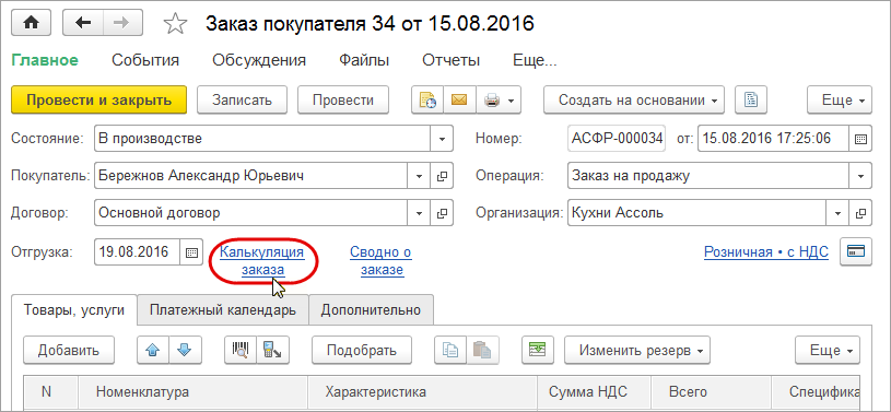 Открыть предварительную калькуляцию можно непосредственно из формы заказа покупателя.