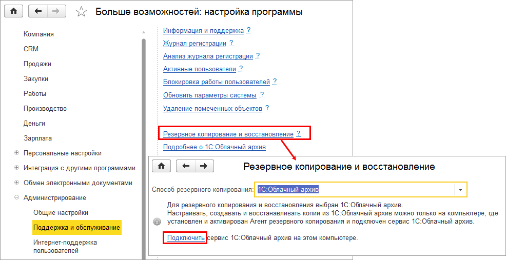 Подробную инструкцию по подключению и настройке сервиса "1С:Облачный архив" Вы сможете найти на сайте ИТС.