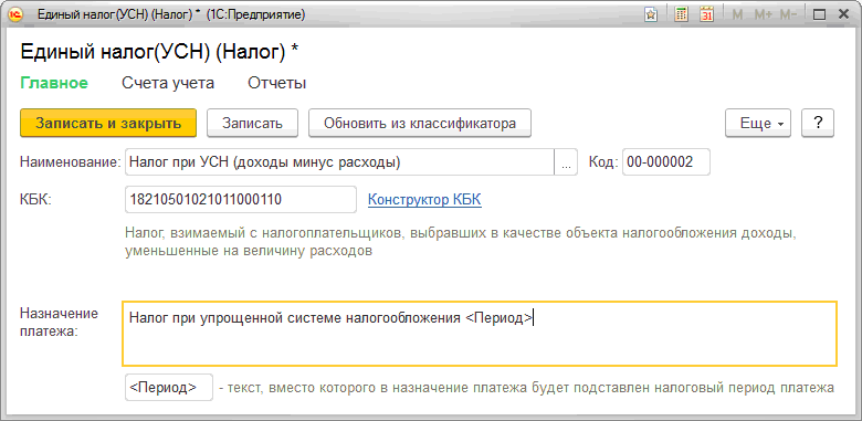 С версии 1.6.7 для элементов справочника "Виды налогов" добавлена возможность указания кода бюджетной классификации (КБК) и соответствующего ему назначения платежа.