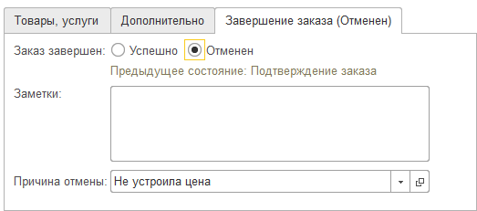 В обоих случаях при выборе состояния "Завершен" в документе появляется вкладка "Завершение заказа", в которой можно выбрать завершен заказ успешно или отменен.