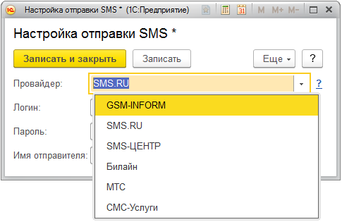 Полный список провайдеров доступен в меню Компания – Администрирование – Почта, SMS, напоминания– Настройка отправки SMS.