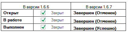 В результате обновления на версию 1.6.7, состояния "Выполнен" и "Отменен" будут объединены в состояние "Завершен".