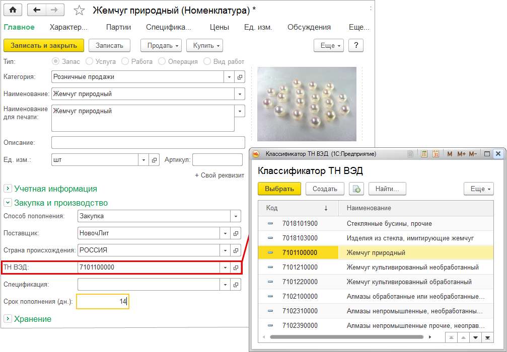 ВЭД, хранящийся в справочнике номенклатуры.