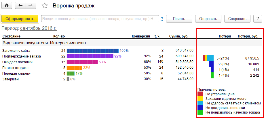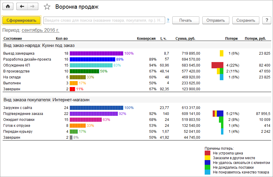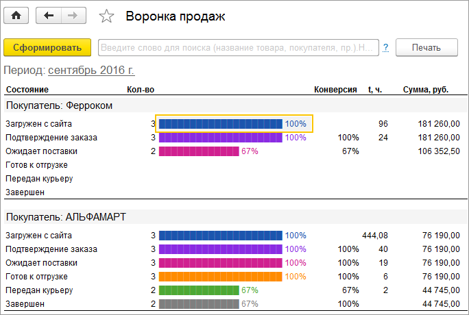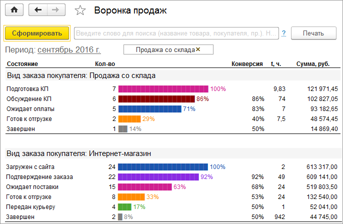 Каждый из этапов отображается визуально в виде цветных полос, длина которых соответствует количественному и процентному соотношению заказов на этих этапах.