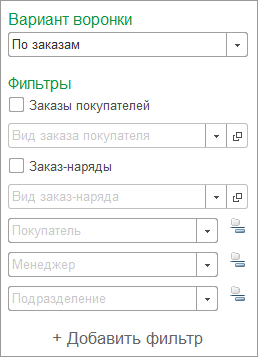 С помощью фильтров пользователь может выбрать, по каким условиям формировать воронку продаж.