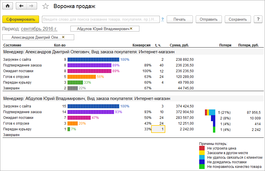 А еще отчет поможет проанализировать эффективность работы отдела продаж и отдельно взятых менеджеров. Этот понятный и информативный инструмент будет отличным помощником для генеральных директоров, руководителей отделов продаж, маркетологов и менеджеров.