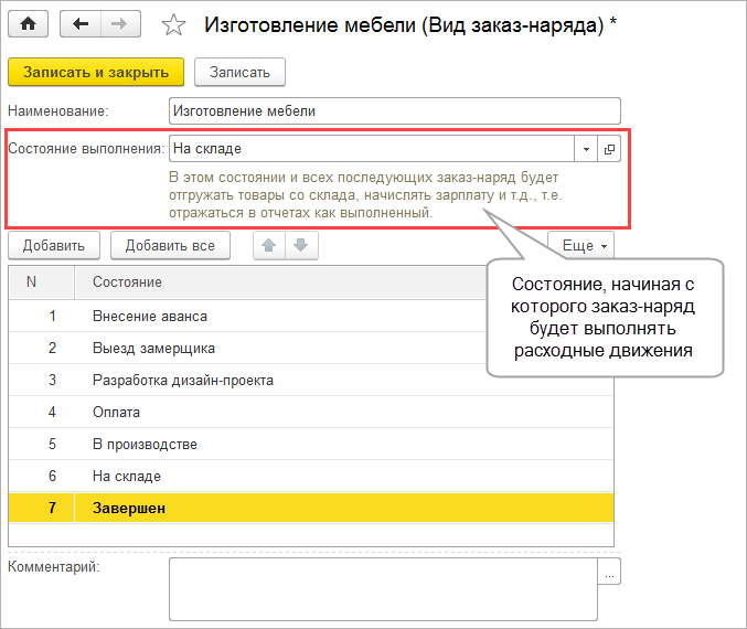 Для заказа-наряда дополнительно потребуется указать состояние выполнения.