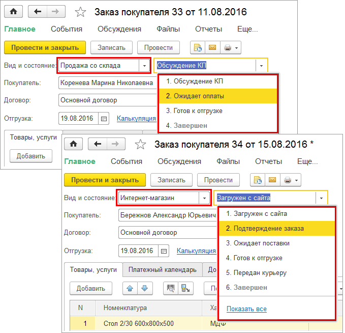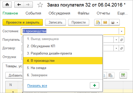В версии 1.6.7 программы 1С:Управление небольшой фирмой мы упростили работу с состояниями заказов.