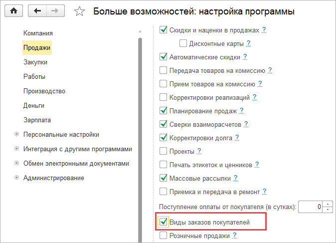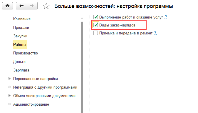 Для компаний, имеющих несколько различных видов заказов, предусмотрены функциональные опции "Виды заказов покупателей" и "Виды заказ-нарядов". Включить их можно в разделе Компания - Еще больше возможностей – Продажи или Работы.