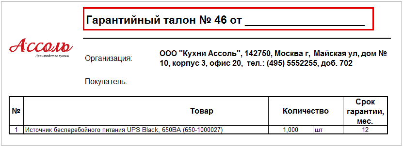 При печати гарантийного талона из документа "Производство" дата заполнена не будет. Предполагается, что эти данные будут указаны менеджером при продаже товара.