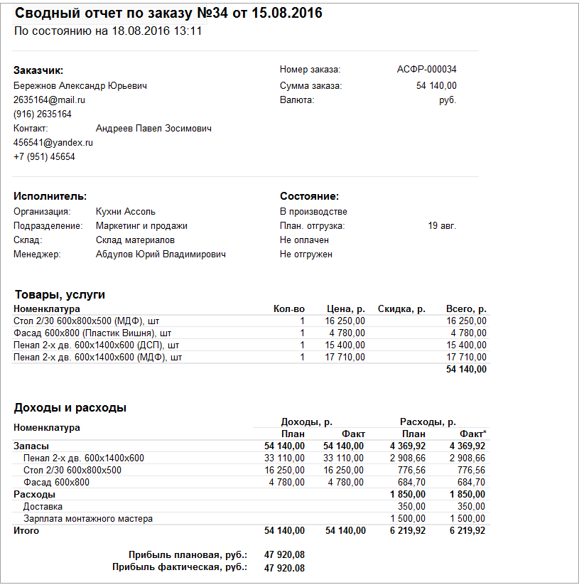 Сравнить плановый расчет с фактическими доходами и расходами по заказу можно в форме "Сводно о заказе".