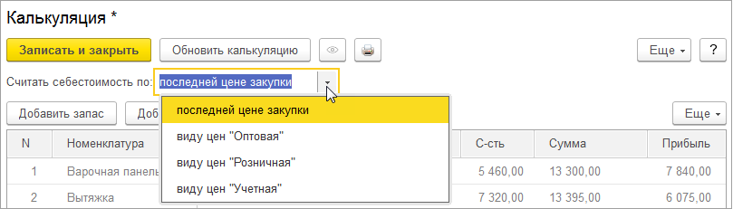 При включенном отображении данных по себестоимости, пользователь может выбирать, по какой цене рассчитывать себестоимость заказа: по последней цене закупки или по одному из заведенных в базе видов цен.