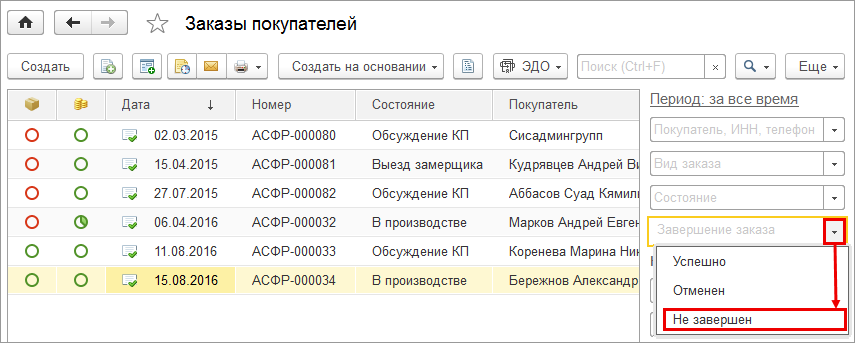 При работе со списком заказов стало возможно отобрать все незавершенные заказы в один клик. Чтобы это сделать необходимо в поле "Завершение заказа" выбрать значение "Не завершен".
