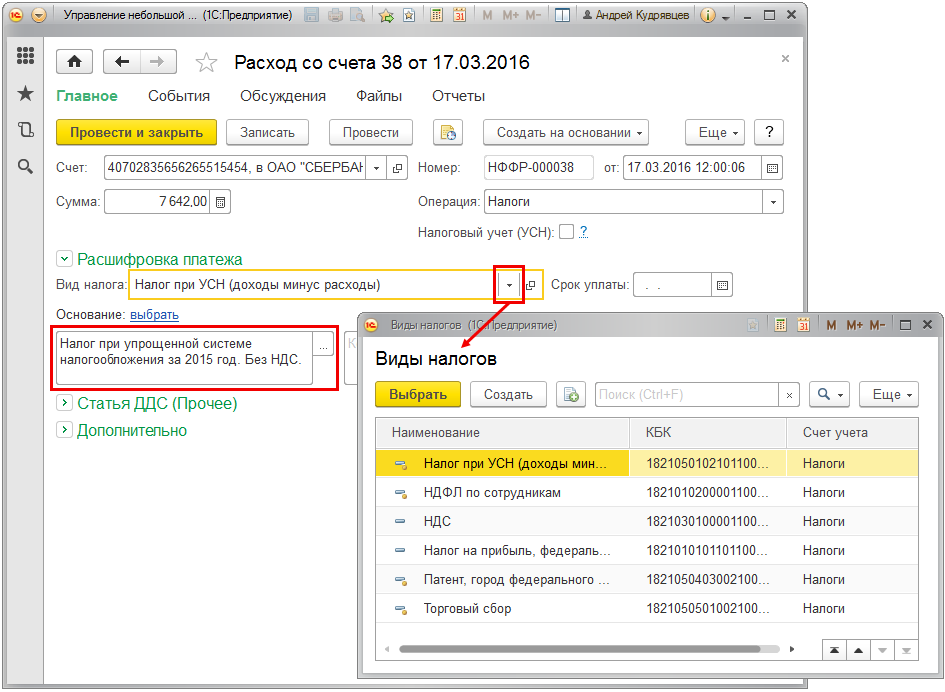 При выборе вида налога в документе "Платежное поручение", "Расход со счета" или "Расход из кассы" в поле "Назначение платежа" будет автоматически заполнен текст назначения, в соответствии с выбранным видом налога.
