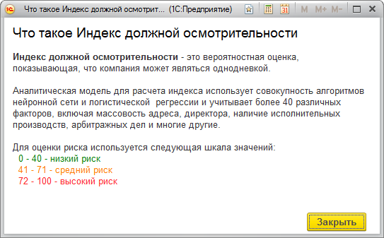 В поле "1СПАРК Риски" отображаются все три индекса. Если нажать на значение индекса, то откроется его краткое описание: