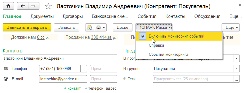 Для этого в карточке контрагента необходимо установить отметку "Включить мониторинг событий".