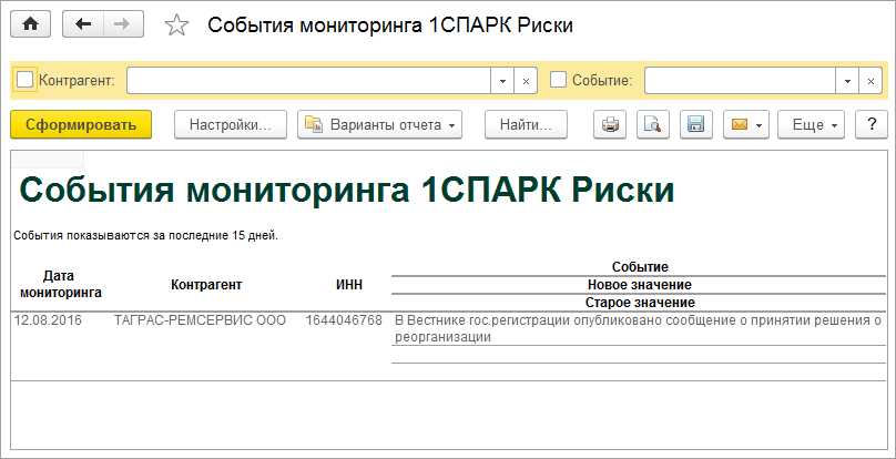 Отчет по всем событиям контрагента можно получить, нажав на кнопку "1СПАРК Риски" и в открывшемся списке выбрав пункт "События мониторинга":