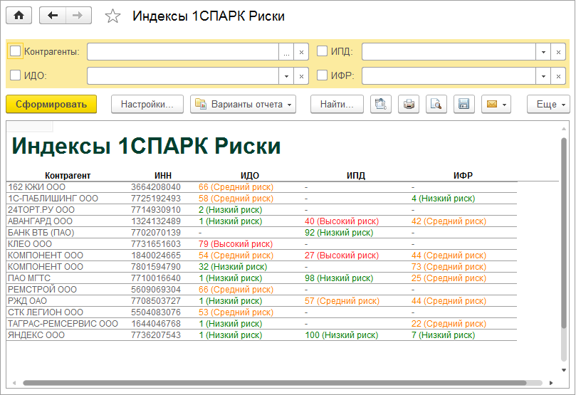 В "1СПАРК Риски" для оценки надежности контрагента представлены три индекса: