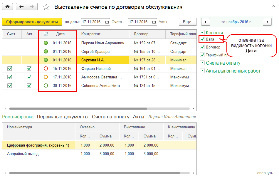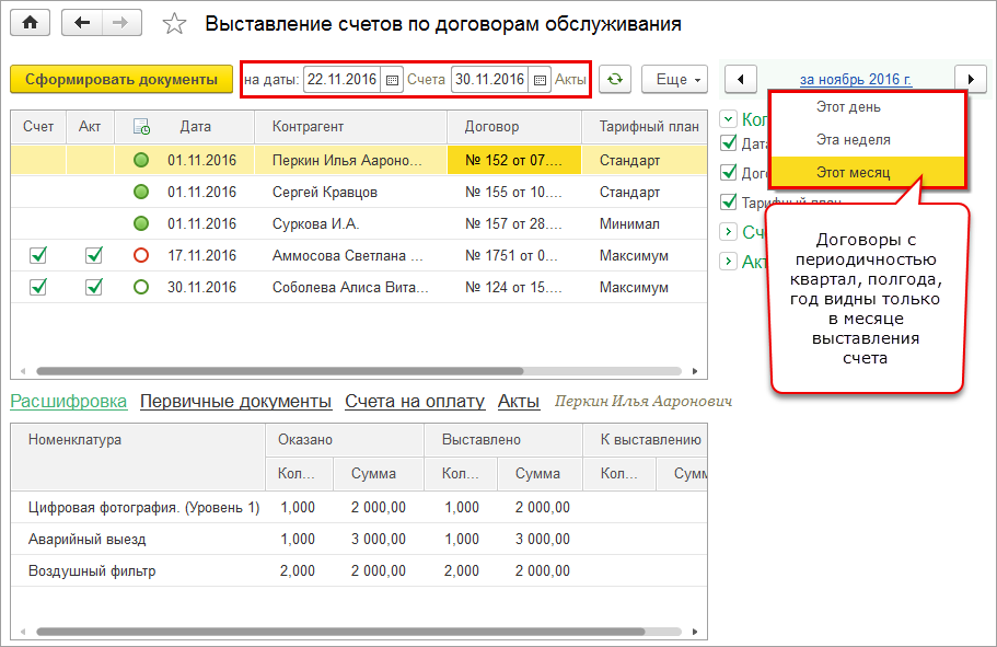 В версии 1.6.9 мы учли пожелания пользователей и реализовали контроль даты выставления счетов для договоров обслуживания.