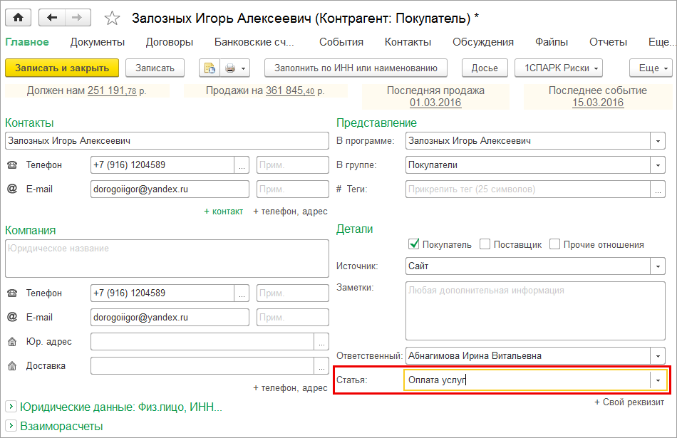 Команда Создать нового покупателя откроет форму создания нового контрагента.
