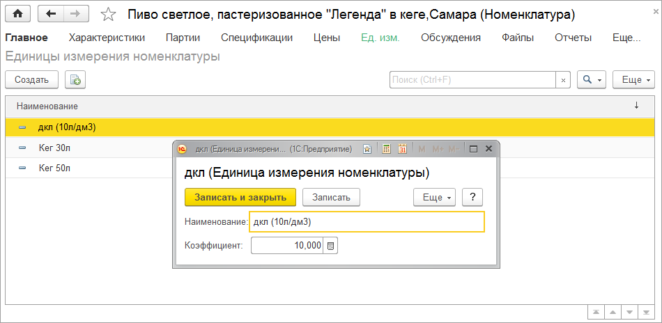 Для номенклатуры, продаваемой в розлив, также необходимо создать дополнительную единицу измерения декалитр. Использование нескольких единиц измерения можно включить в настройках программы (Компания - Еще больше возможностей - Закупки).